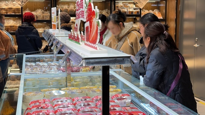 熟食烘焙區(qū)人氣高。熟食檔口有羊雜系列、香酥鴨、雙匯小甜腸、奧爾良烤雞;烘焙區(qū)有雙拼瑞士卷、酥香蛋撻?!?5粒草莓奶油盒子蛋糕”是明星產品,用新鮮草莓搭配戚風蛋糕,口感豐富。