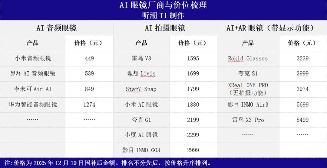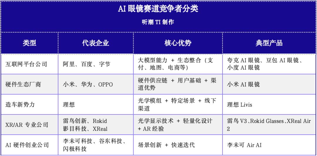 目前市面上的AI眼鏡種類繁多,定價(jià)跨度很大,從數(shù)百元到數(shù)千元不等,主要原因是產(chǎn)品形態(tài)的差異化定位。在這場(chǎng)激烈的競(jìng)爭(zhēng)中,并非所有參與者都處于同一起跑線。目前國(guó)內(nèi)可清晰劃分為以下五類競(jìng)爭(zhēng)者: