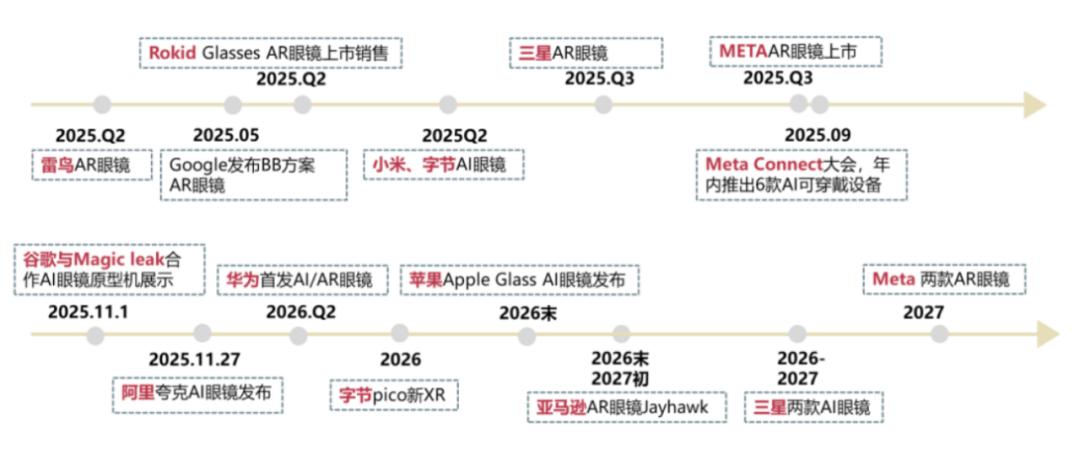 Meta旗下的Ray-Ban智能眼鏡在2025年2月銷量突破200萬(wàn)副,全年出貨量預(yù)計(jì)沖刺400至500萬(wàn)副;海外科技巨頭谷歌與三星聯(lián)手重啟AI眼鏡項(xiàng)目,蘋果也確定了AI眼鏡的發(fā)布時(shí)間表。