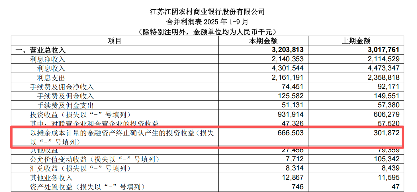 拆解數(shù)據(jù)可以發(fā)現(xiàn),這種投資收益的爆發(fā)式增長,一定程度上源于銀行集中賣出非短期持有債券兌現(xiàn)收益。數(shù)據(jù)顯示,江陰銀行前三季度以攤余成本計量的金融資產(chǎn)終止確認產(chǎn)生的投資收益為6.67億元,而去年同期僅為3.02億元。