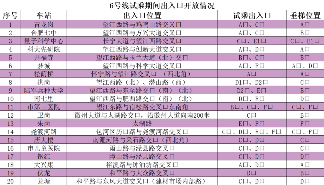 參與試乘的站點包括:龍?zhí)琳?、伏龍站、大興集站、鋼紅站、市兒童醫(yī)院站、唐大樓站、堯渡河路站、朱崗站、衛(wèi)崗站、市第三醫(yī)院站、南七里站、陸軍兵種大學站、洪崗站、松蔭橋站、夢城站、開福寺站、科大先研院站、量子科學中心站、合肥七中站、青龍崗站。