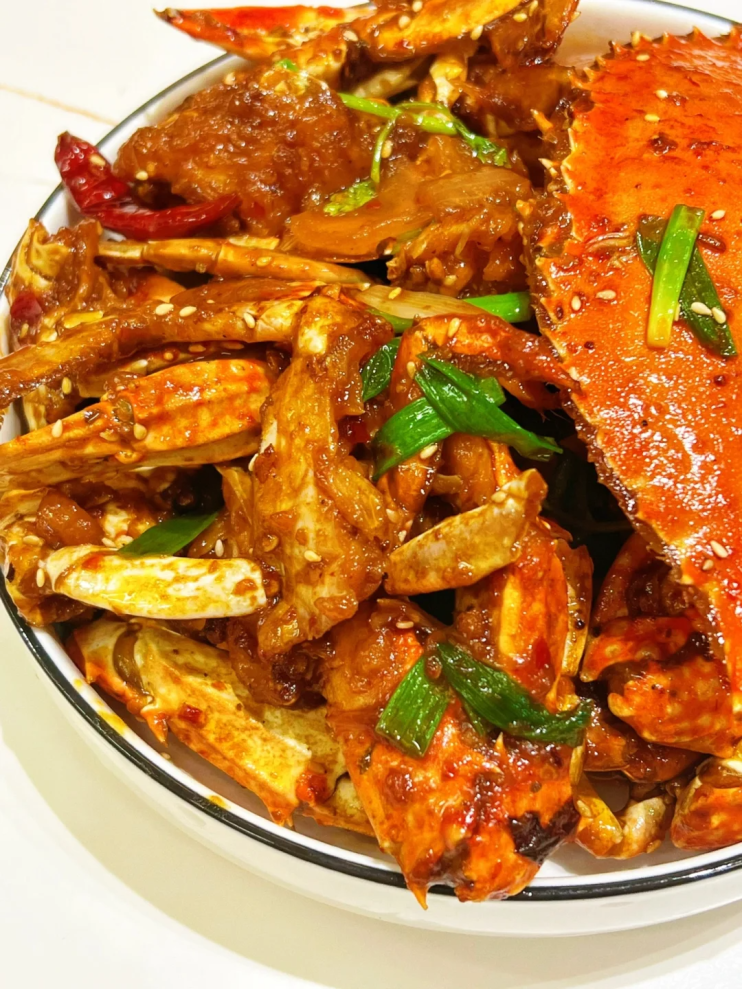 蟹斬件覆蔥姜,熱油澆淋香氣四溢,蔥香裹蟹,鮮甜與鑊氣交融。