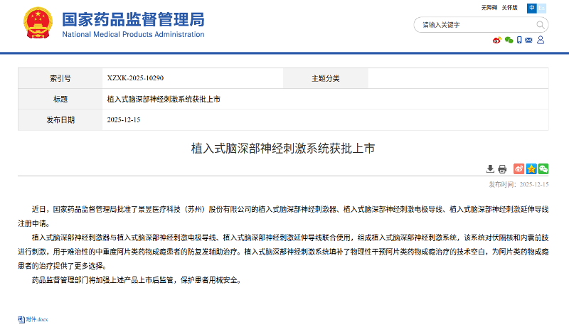 近日,國家藥品監(jiān)督管理局(NMPA)正式批準(zhǔn)景昱醫(yī)療科技(蘇州)股份有限公司的植入式腦深部神經(jīng)刺激器、植入式腦深部神經(jīng)刺激電極導(dǎo)線、植入式腦深部神經(jīng)刺激延伸導(dǎo)線三類產(chǎn)品注冊申請。