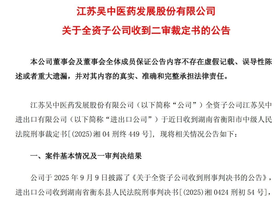 12月19日晚間,處于退市進(jìn)程中的江蘇吳中(SH600200,股價(jià)0.35元,市值2.49億元)發(fā)布公告稱,其全資子公司江蘇吳中進(jìn)出口有限公司近日收到湖南省衡陽市中級(jí)人民法院的刑事裁定書,裁定駁回上訴、維持原判,該結(jié)果為終審裁定。