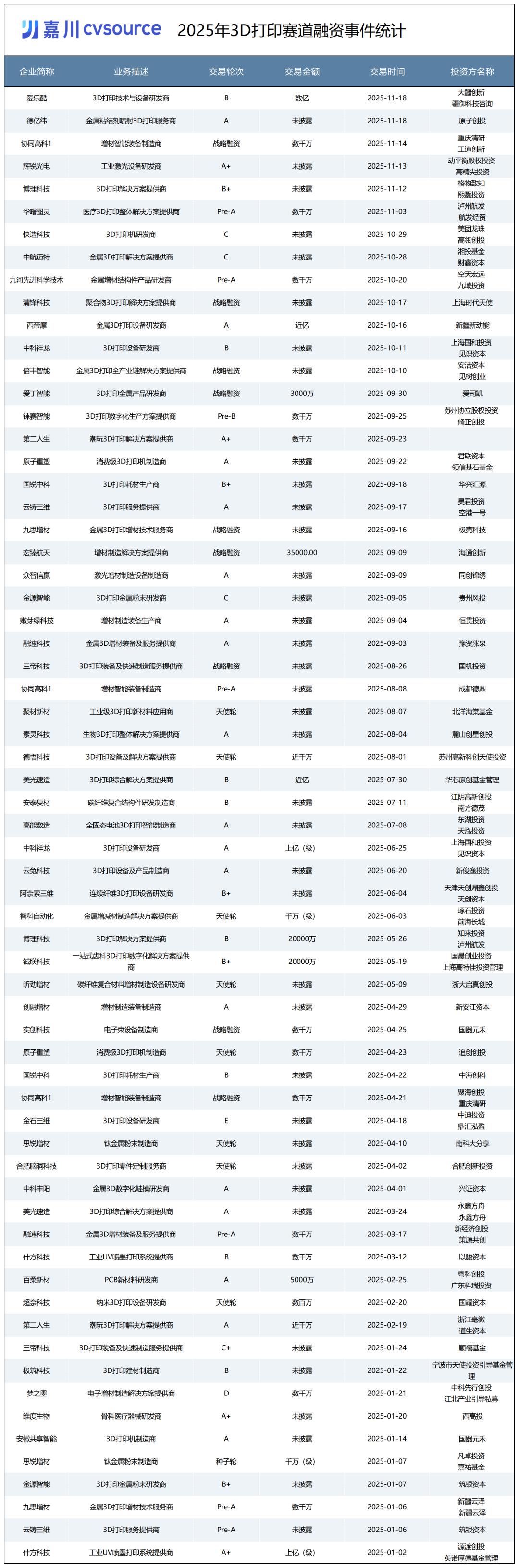 資本的動(dòng)向,也側(cè)面反映了行業(yè)的火熱。2025年末的短短兩個(gè)月內(nèi),3D打印賽道密集傳來(lái)重磅投融資消息: