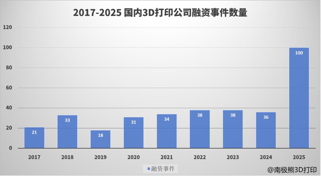 零散的融資案例之外,一組核心數(shù)據(jù)更能印證賽道的熱度飆升。據(jù)南極熊3D打印的數(shù)據(jù),過(guò)去幾年,國(guó)內(nèi)3D打印行業(yè)投融資事件基本上維持在30-40個(gè)之間,而2025年的融資事件直接達(dá)到100個(gè)(涉及81家公司,部分公司融資2-3次),翻了快3倍。