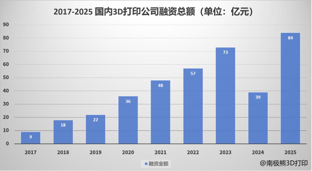 融資金額維度同樣印證了賽道的資本熱度。據(jù)同一數(shù)據(jù)源,2025年國(guó)內(nèi)3D打印行業(yè)投融資總額約84億元,創(chuàng)歷史新高并扭轉(zhuǎn)2024年下跌走勢(shì)。不過(guò)行業(yè)融資并非持續(xù)高增,2023-2024年受資本市場(chǎng)大環(huán)境影響有所承壓。