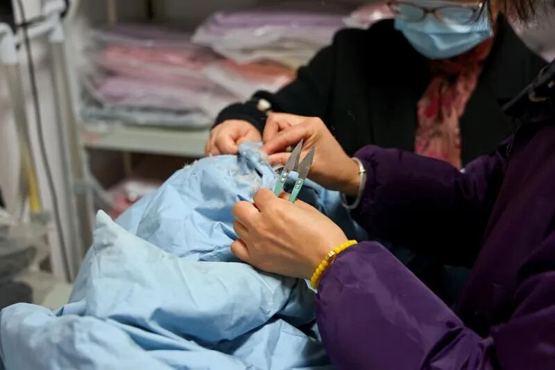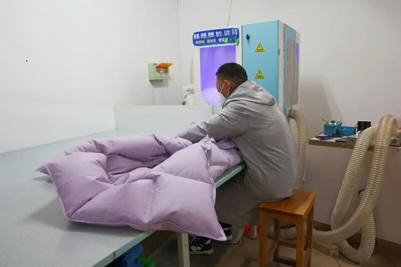 據(jù)悉,羽絨翻新的規(guī)格可以靈活選擇,通常七八件舊羽絨服就能制作一條冬被,春秋被則需要5到6件?!笆紫劝雅f衣服里的絨全部拆取出來(lái),經(jīng)過(guò)過(guò)濾、消毒,篩掉結(jié)塊、變質(zhì)的劣質(zhì)絨,再把處理好的優(yōu)質(zhì)絨充進(jìn)新被套,整個(gè)過(guò)程都是透明可見(jiàn)的,大約兩個(gè)小時(shí)就能取到做好的被子。”王春英一邊拆解檢查羽絨,一邊向大家說(shuō)明。