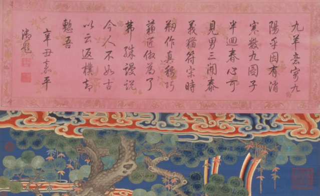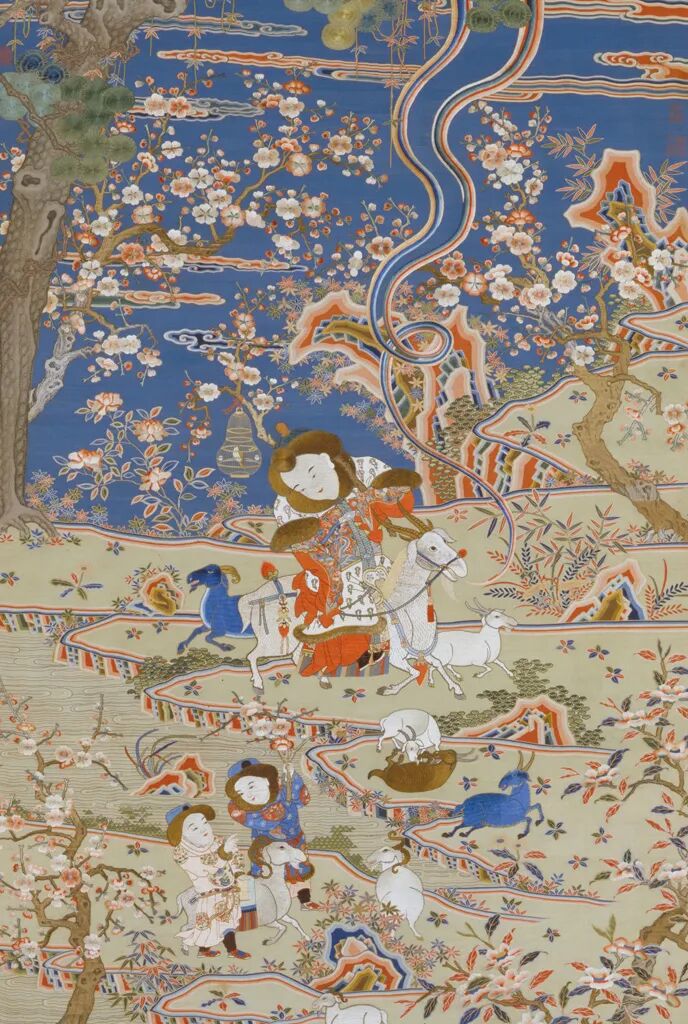 圖中主要人物、動(dòng)物及樹(shù)木等在緙絲上加繡。上半幅以深藍(lán)色為天空,襯托五彩祥云、青松、梅樹(shù)與山石;下半幅以淺秋香色作路石和水面,3名男童與9只小羊嬉戲。9只小羊寓意“九陽(yáng)消寒”,3名童子屬陽(yáng),取“三陽(yáng)開(kāi)泰”之意。