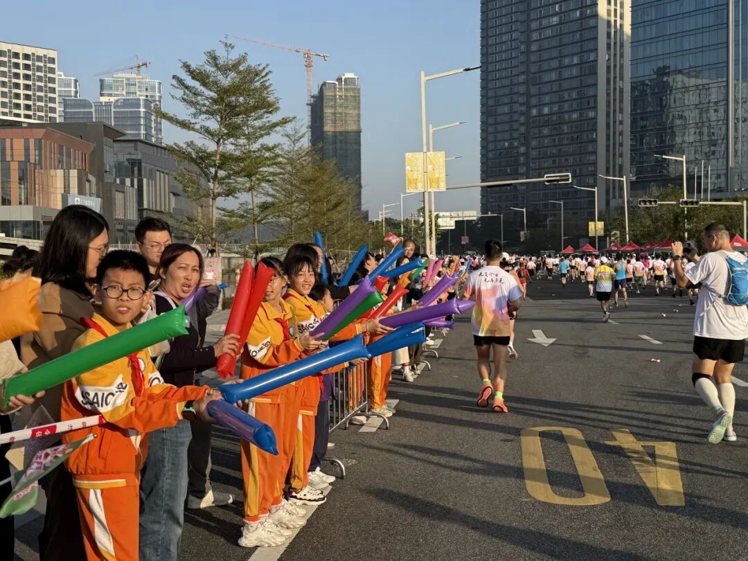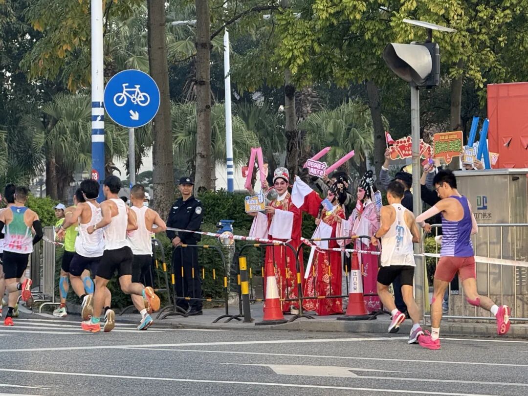 濱江綠道轉(zhuǎn)港口二路處,江門本地S-SC半減七樂團(tuán)以激昂鼓點(diǎn)、活力演奏為選手加油,動感旋律與奔跑節(jié)奏完美契合。