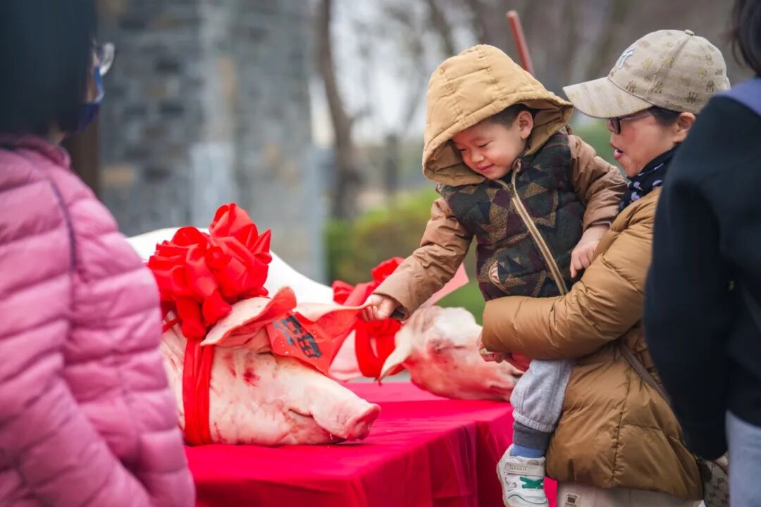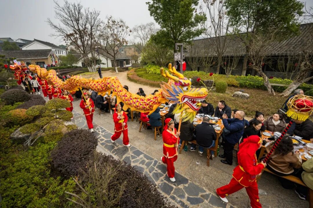 宴席期間,充滿鄉(xiāng)土儀式感的抬豬抬羊巡游隊伍穿梭在餐桌之間,非遺送春表演把美好的祝愿送到每一桌游客心中。