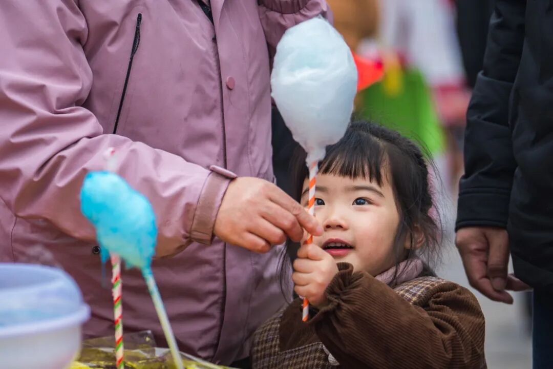 為了讓大家有更豐富的體驗,現(xiàn)場安排了充滿高淳特色的民俗展演,還設置了套圈、投壺、抽獎等互動游戲。煙火市集里,糖畫、棉花糖、赤豆元宵等特色美食一應俱全。