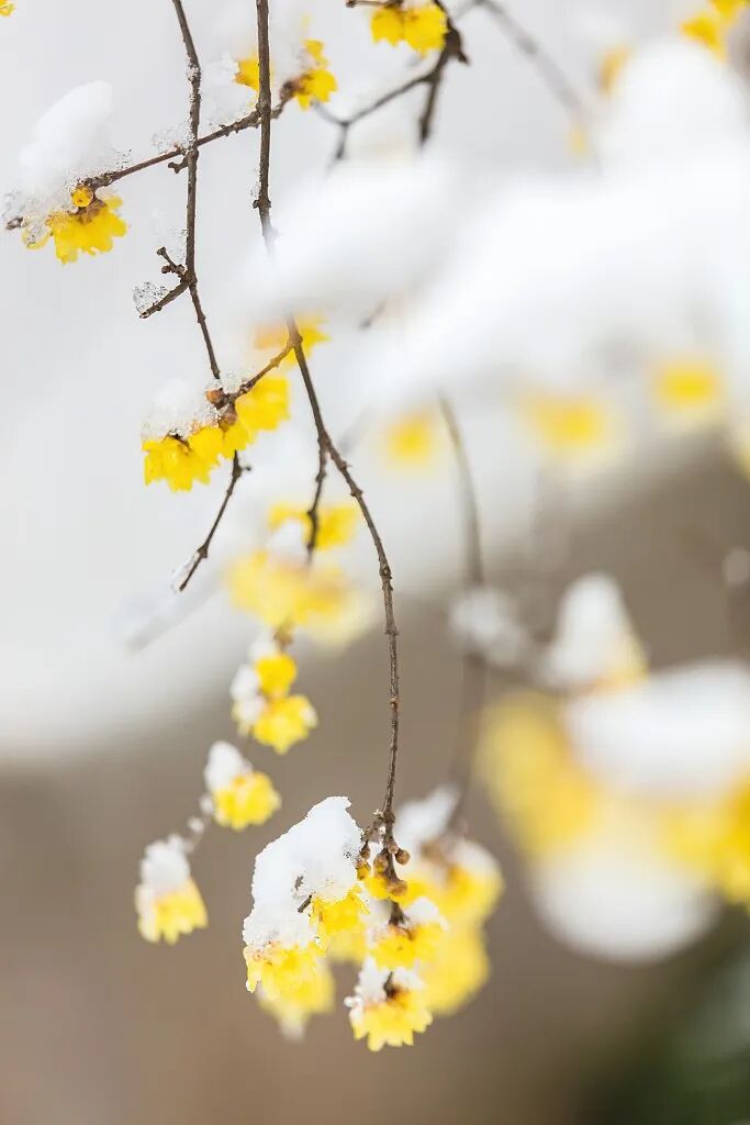 蠟梅也叫臘梅、黃梅花,李時珍在《本草綱目》中說它因與梅同期開放、香氣相近且色似蜜蠟得名,《花鏡》補充因其臘月開放故稱臘梅。汪曾祺兒時會用銅絲串蠟梅花骨朵和天竺果做珠花,送給長輩插在鬢間拜年。