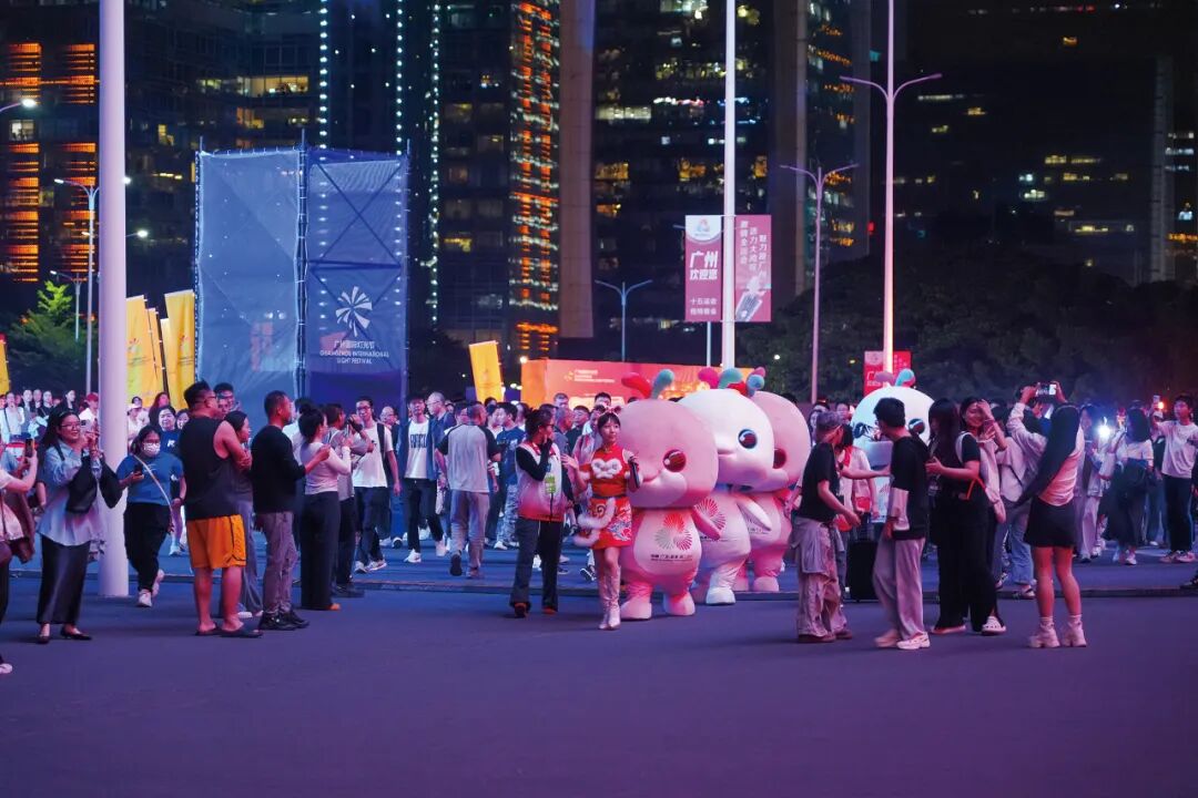 2025年11月17日,廣州國際燈光節(jié)上。第十五屆全運會吉祥物“喜洋洋”和“樂融融”與觀眾互動。(圖/CFP)