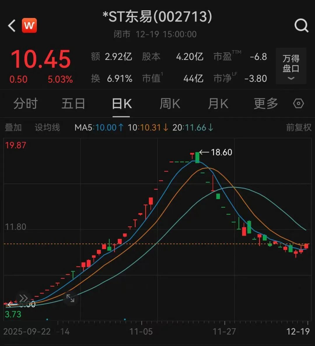 值得關(guān)注的是,9月以來*ST東易股價波動劇烈。在“12連板”后,公司于11月14日停牌核查,11月19日復(fù)牌當(dāng)日漲停,報18.54元/股。但11月20日起股價持續(xù)下跌,Wind數(shù)據(jù)顯示,截至12月19日收盤,股價已降至10.45元/股。
