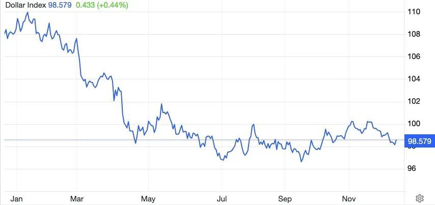 這是美元指數(shù)今年的走勢(shì)。可以清晰看到,美元上半年下跌約10%,下半年則在98附近震蕩。