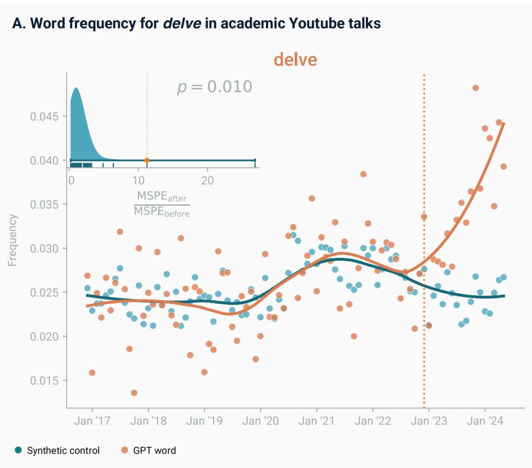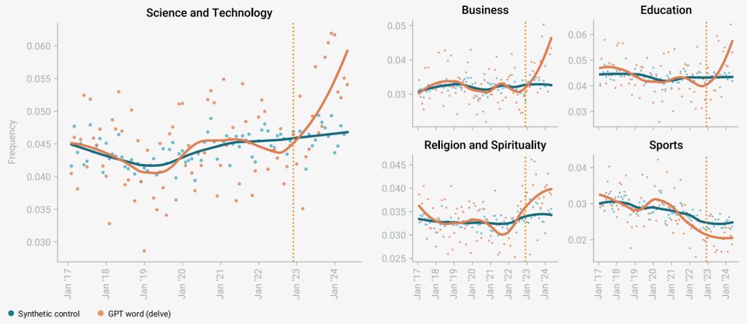 為理清這種可能性,研究人員采用計量經(jīng)濟學中的“合成控制法”。他們利用大數(shù)據(jù)構建了一個“沒有AI發(fā)布”的平行宇宙模型。在那個虛擬世界里,人類語言按過去的演變邏輯緩慢進化——Delve這類詞匯的使用率,平穩(wěn)得如同常年無波動的市場(開個玩笑)。