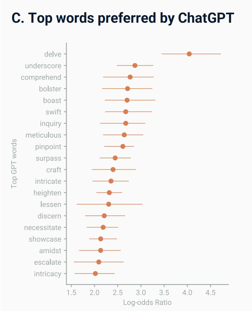 而在現(xiàn)實世界中,這些詞的暴漲與AI技術發(fā)布時間點完美契合,這讓AI作為語言習慣改變的主要因素更具說服力。