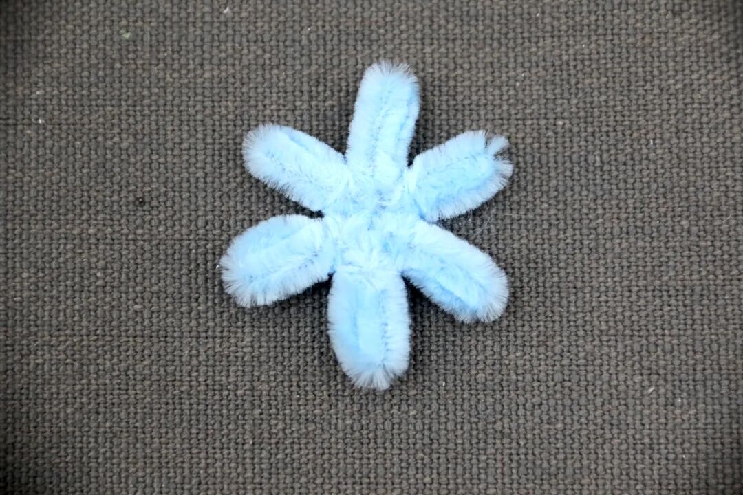 3. 另外拿一根藍(lán)色扭扭棒,扭出六個(gè)均勻分布的小圓弧,作為雪花的中心連接部分;