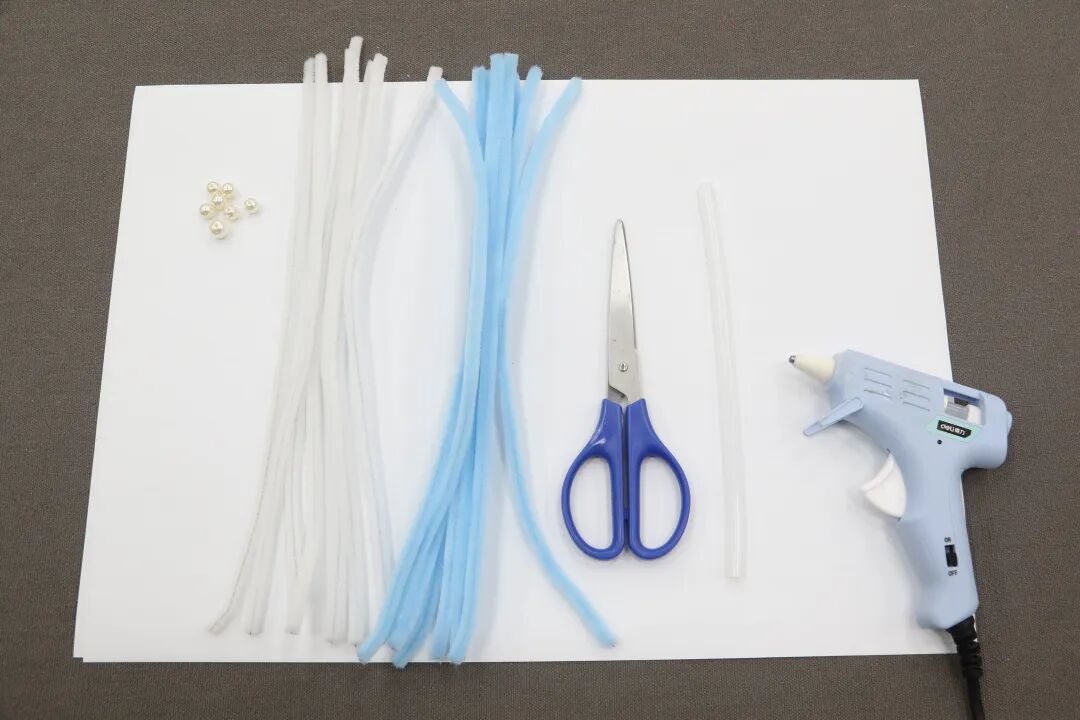 首先來(lái)準(zhǔn)備制作材料:扭扭棒、剪刀、膠棒、膠槍和裝飾用的珍珠,這些簡(jiǎn)單的材料就能幫我們打造出精致的雪花啦。