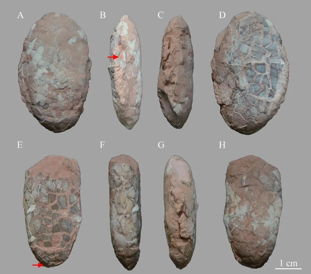 此次發(fā)現(xiàn)的恐龍蛋化石最大個體長約17厘米,依據(jù)其長形外觀、蛋殼表面脊?fàn)罴y飾,以及徑切面呈現(xiàn)的錐體層與柱狀層結(jié)構(gòu),被歸入長形蛋科。進(jìn)一步研究顯示,蛋殼厚度不足1毫米,錐體層與柱狀層界限模糊,符合長形蛋屬特征。因標(biāo)本受壓實變形與侵蝕影響較大,暫定為長形蛋屬未定種。