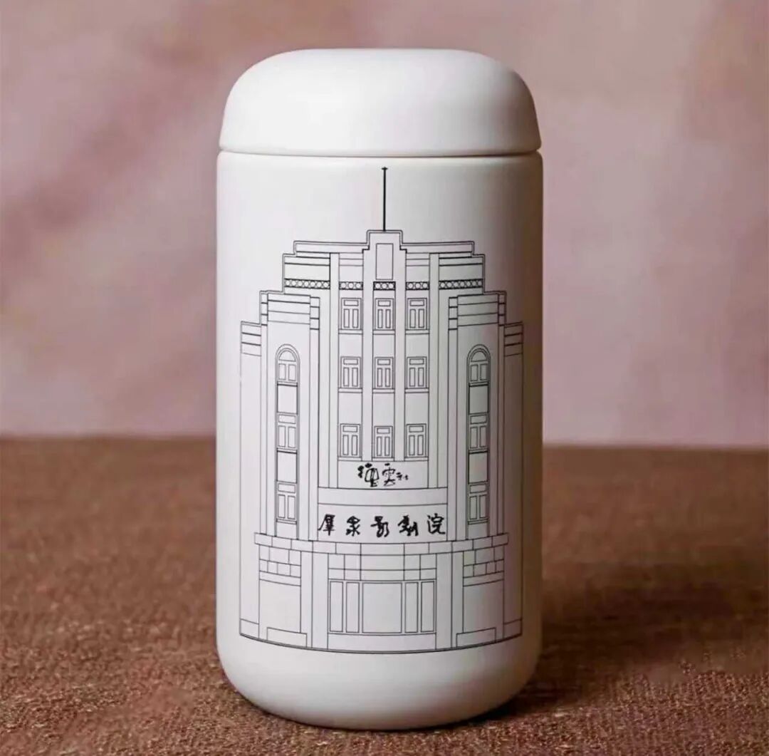 它的靈感來(lái)自承載虹口光影記憶的歷史建筑“群眾影劇院”,白色杯體上飾有影院標(biāo)志性建筑線稿,簡(jiǎn)約又時(shí)尚。