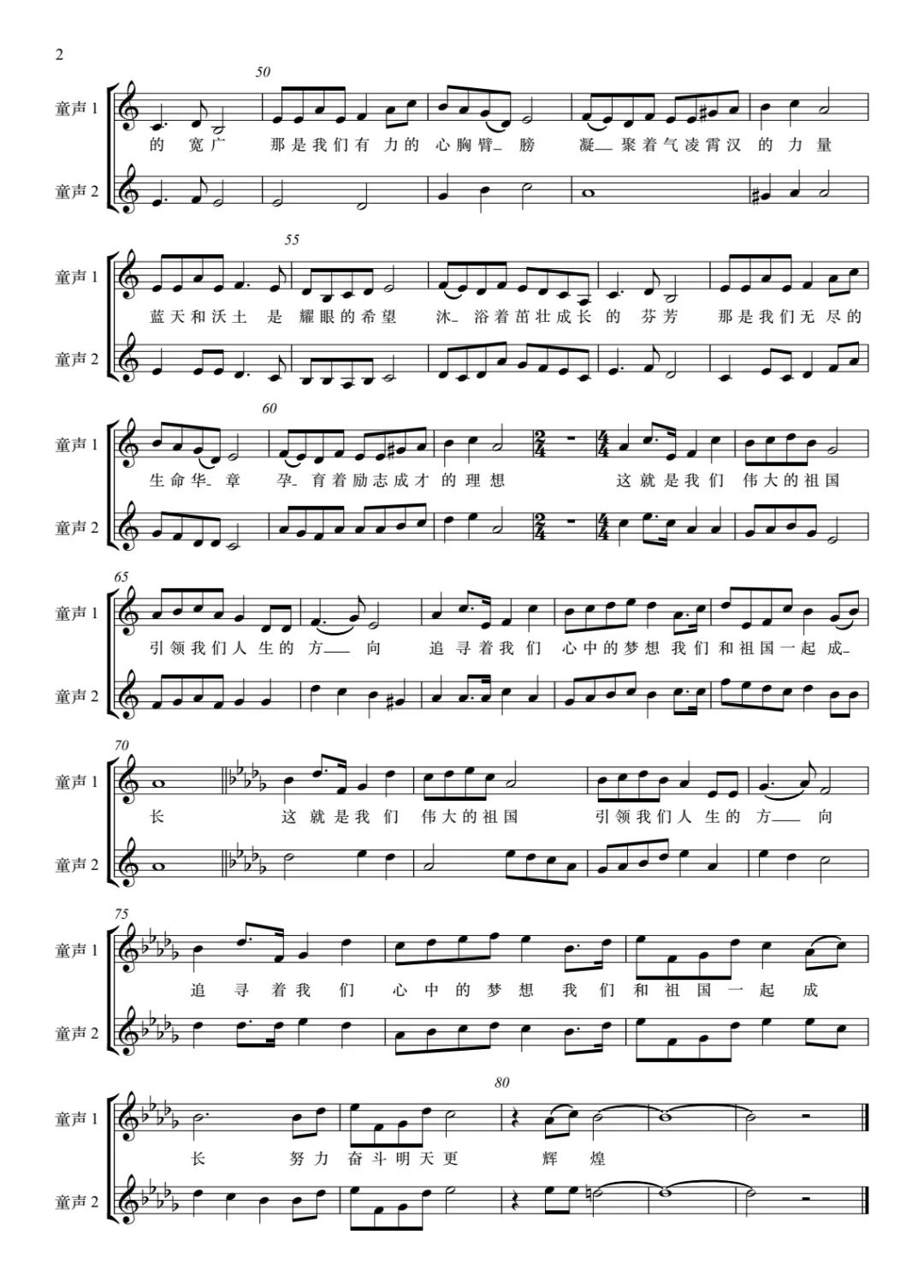 首先,歌曲的主題動機既有活潑的律動,又有深情的歌唱,在不同聲部間巧妙重復(fù)與發(fā)展。旋律的每一次起伏都好似在訴說成長路上的故事,就像生活中既有歡笑也有淚水,既有收獲也有期待。尤其值得關(guān)注的是歌曲中的巧妙編排,作曲家通過聲部間的交錯與融合,營造出豐富立體的音響效果。高音部如同藍天上的白云,中低音聲部如同深厚的大地,聲部交織時,完美象征著我們與祖國大地密不可分的聯(lián)系。