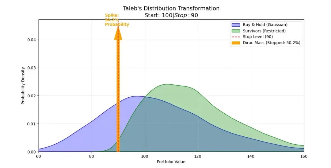 但問題在于10%止損線處出現(xiàn)虧損峰值,論文借用數(shù)學(xué)名詞“狄拉克質(zhì)量(The Dirac Mass)”來描述。止損雖能避免災(zāi)難,卻也切斷了反彈機(jī)會(huì),導(dǎo)致大量交易以止損收?qǐng)?,集中在止損線上,形成狄拉克質(zhì)量。