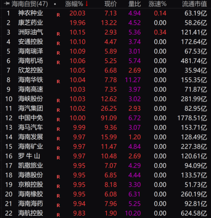 隨著熱度攀升,市場也出現(xiàn)積極反應(yīng)。今日早盤,海南自貿(mào)概念板塊持續(xù)拉升,神農(nóng)種業(yè)收獲20%漲停,海馬汽車、康芝藥業(yè)、海南機(jī)場、欣龍控股、海南瑞澤等二十多只股票漲停,隨后“免稅一哥”中國中免也漲停,免稅店概念股再次爆發(fā)。