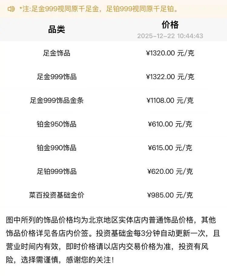 菜百首飾的足金飾品報價1320元/克,足金999飾品報價1322元/克,足金999飾品金條報價1108元/克。