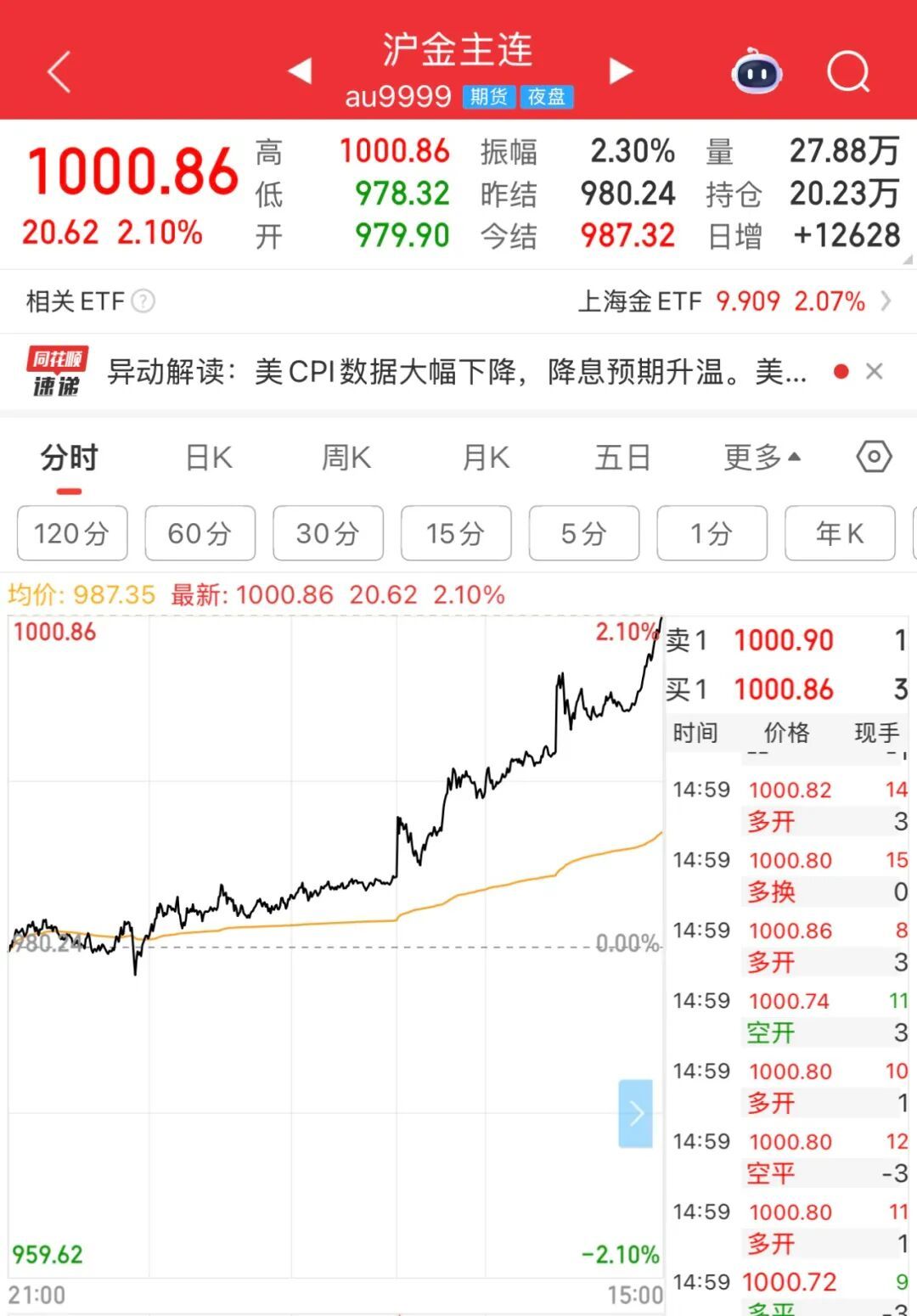國(guó)內(nèi)市場(chǎng)方面,滬金主力合約收盤(pán)上漲2.1%,報(bào)1000.86元/克。