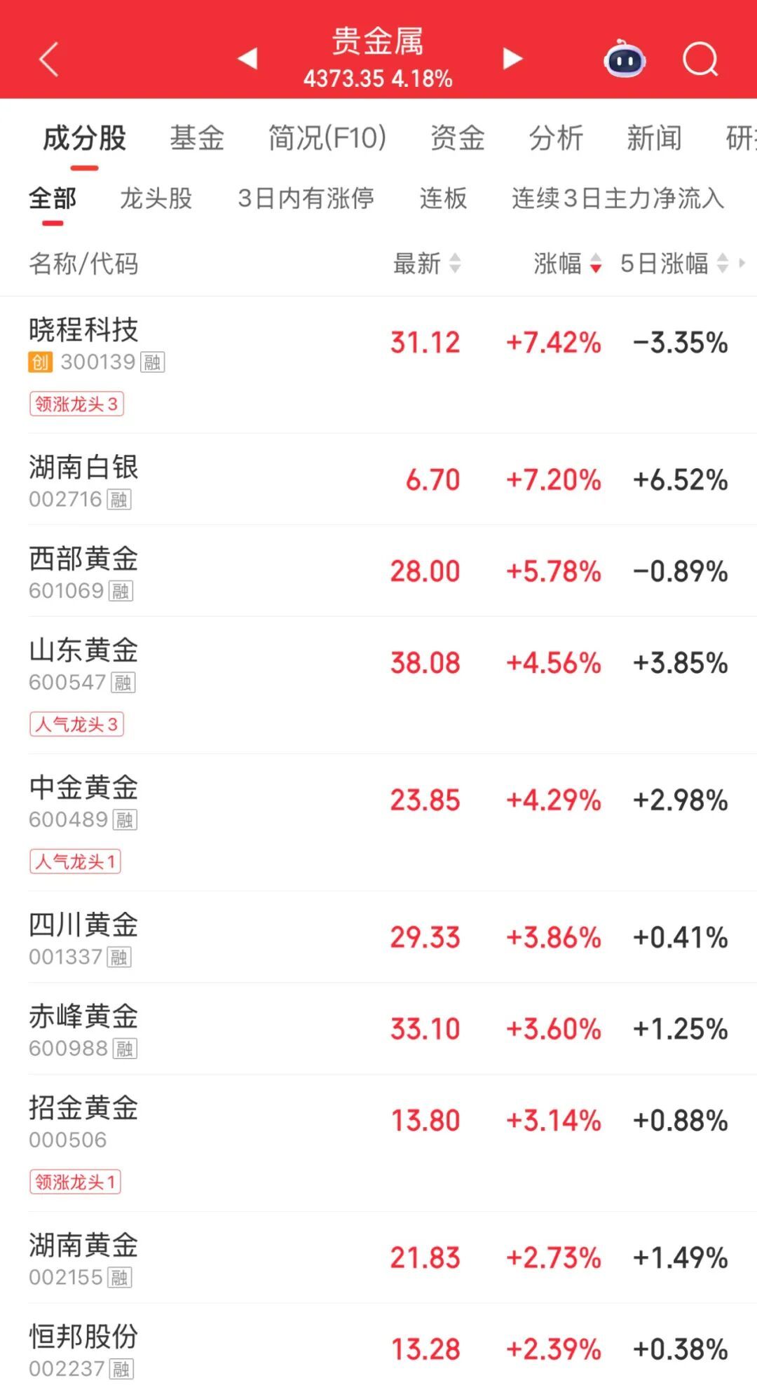 貴金屬概念股全天震蕩走高,截至收盤(pán),同花順貴金屬板塊漲幅達(dá)4.18%。個(gè)股方面,曉程科技、湖南白銀大漲超7%。