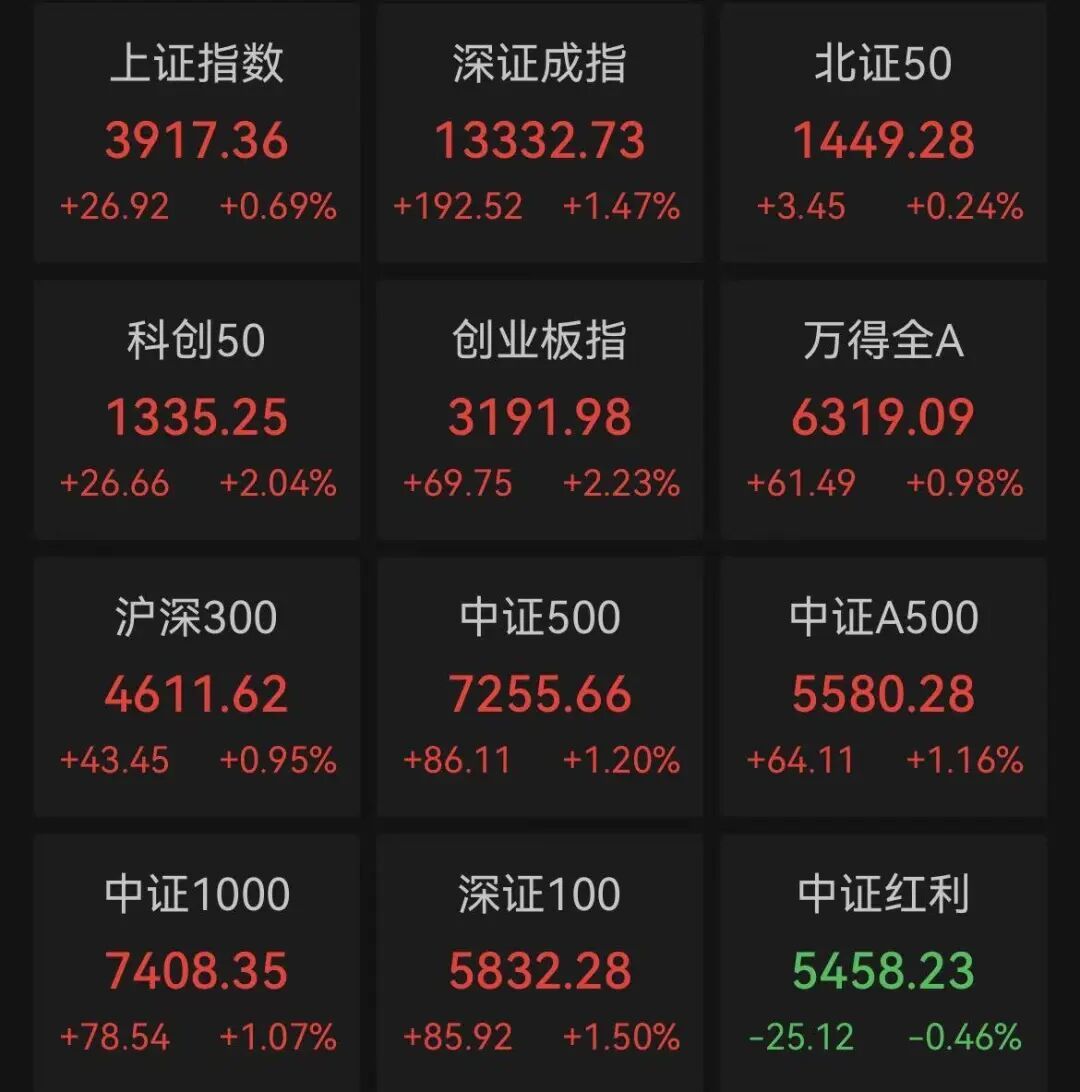 從具體行情來看,兩市主要股指盤中強(qiáng)勢攀升,創(chuàng)業(yè)板指、科創(chuàng)50指數(shù)漲幅突破2%。截至收盤,滬指上漲0.69%,報3917.36點;深證成指上漲1.47%;創(chuàng)業(yè)板指上漲2.23%;科創(chuàng)50指數(shù)上漲2.04%。滬深北三市當(dāng)日合計成交額達(dá)18825億元,較前一交易日增加1336億元。