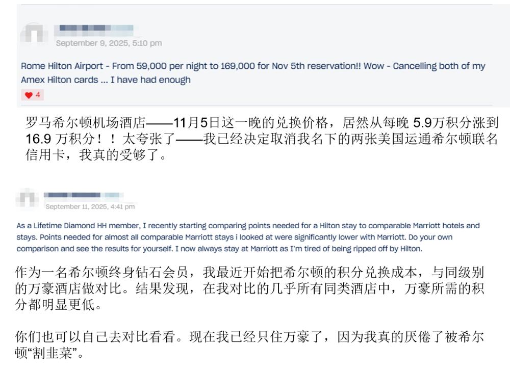 比如海外社區(qū)里,有國外網(wǎng)友發(fā)現(xiàn)積分大幅貶值后,羅馬希爾頓機場酒店的兌換價格從每晚5.9萬積分漲到16.9萬積分,直接讓他決定取消美國運通希爾頓聯(lián)名信用卡。