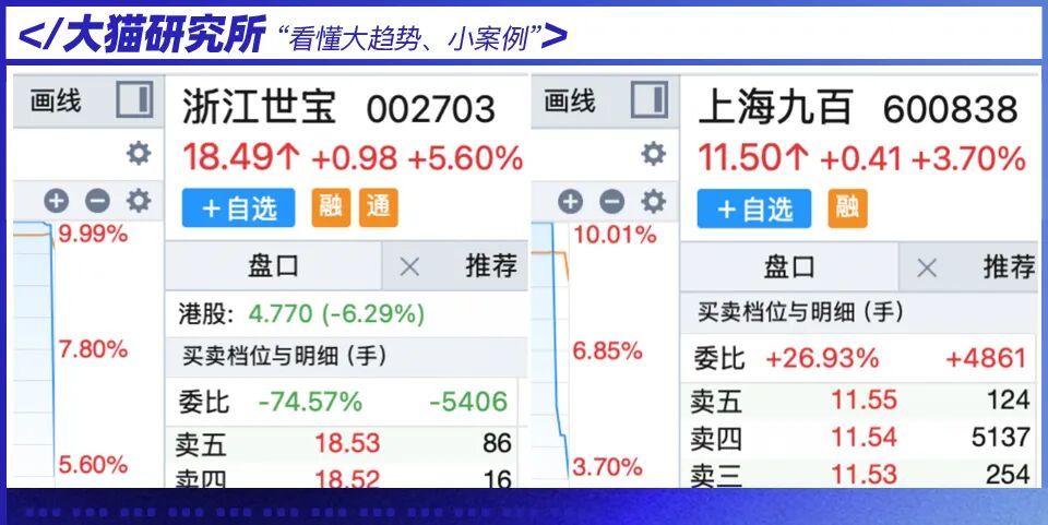 上周五平潭發(fā)展與東百集團(tuán)尾盤大幅跳水,東百集團(tuán)最后3分鐘從漲停板直接翻綠,單日跌幅達(dá)10%;平潭發(fā)展股價從15.5元急挫至13.6元,跌幅超12%。無獨(dú)有偶,今日浙江世寶與上海九百再度上演類似戲碼,均在收盤前幾分鐘從漲停板快速回落,上海九百下跌6.3%,浙江世寶下跌5.4%。