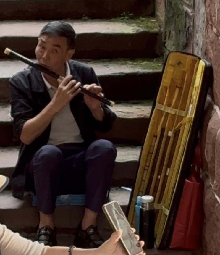 上個(gè)月,在江邊的老城墻下面偶遇了這位獨(dú)自演奏的大爺。他的腳邊放著保溫杯和花露水,身下墊著的是一個(gè)未拆塑料膜的泡沫墊,在一切從簡(jiǎn)的基礎(chǔ)下,只有樂器盒里裝滿了各種長(zhǎng)短管。