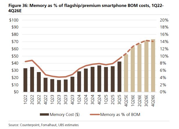 瑞銀認(rèn)為,蘋果和三星憑借現(xiàn)金儲備和高端市場份額更具優(yōu)勢,中小廠商或面臨市場份額流失。電子消費品通縮時代結(jié)束,AI帶來「AI稅」:端側(cè)AI要求更大內(nèi)存,云端AI搶走晶圓配額,2025年末至2026年,安卓和蘋果陣營均面臨成本壓力。