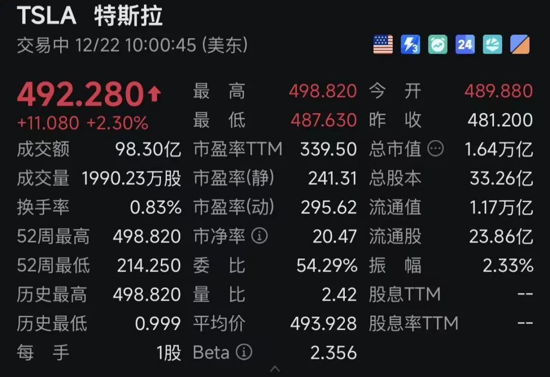在個股表現(xiàn)方面,特斯拉的股價再次創(chuàng)下歷史新高,盤中價格一度接近500美元,截至發(fā)稿時其成交額已接近100億美元。