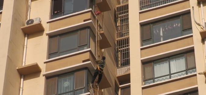 消防員到場(chǎng)勘察后發(fā)現(xiàn),工人被安全繩懸吊在9層外窗僅0.3米寬的平臺(tái)上,立足點(diǎn)極不穩(wěn)定。更棘手的是,9層和10層的戶主短時(shí)間內(nèi)無(wú)法回家,無(wú)法從室內(nèi)展開(kāi)救援。