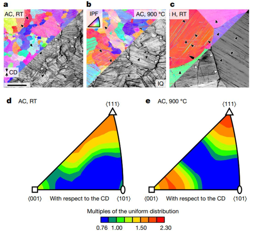 1. 圖4a-c展示了Cr-36.1Mo-3Si合金在室溫和900℃壓縮至約6%塑性應(yīng)變后縱向截面的取向成像顯微圖。彩色編碼圖反映了相對于壓縮方向(CD)的晶體學取向,灰度圖則顯示衍射圖案質(zhì)量。圖4d-e中對晶體學取向的定量分析表明,存在略傾向于平行壓縮方向的?100?/?111?取向。這是由位錯沿?111?方向在{12-1}至{13-2}晶面上滑移,導(dǎo)致滑移面法向朝壓縮方向旋轉(zhuǎn)所致。