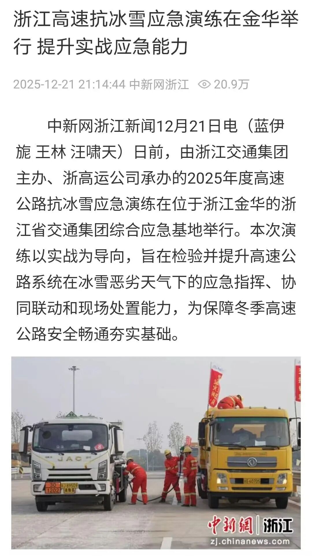 12月21日,中新網(wǎng)客戶端發(fā)布《浙江高速抗冰雪應(yīng)急演練在金華舉行 提升實(shí)戰(zhàn)應(yīng)急能力》,報(bào)道2025年度高速公路抗冰雪應(yīng)急演練在金華開展,以實(shí)戰(zhàn)為導(dǎo)向,為保障冬季高速公路安全暢通奠定堅(jiān)實(shí)基礎(chǔ)。