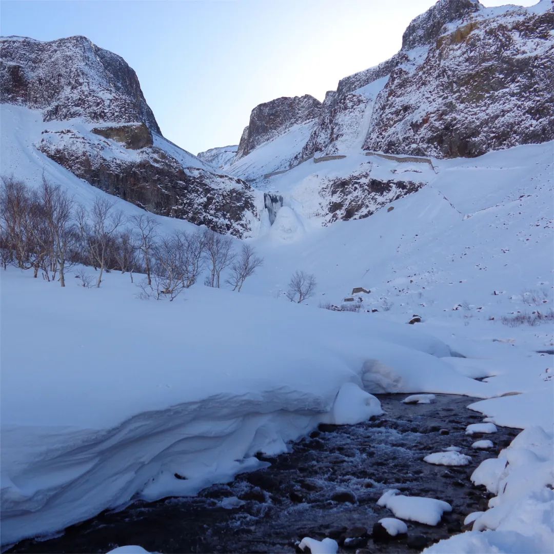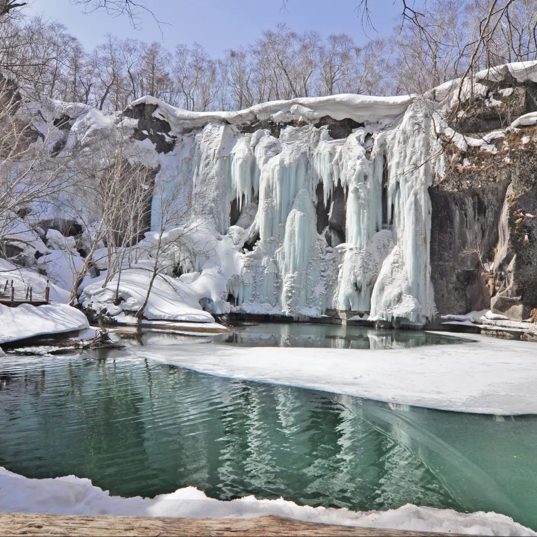 火山巖柱被冰雪包裹,原本奔騰的瀑布凝成巨大的冰瀑,形態(tài)各異,蔚為壯觀,展現(xiàn)出大自然的鬼斧神工。