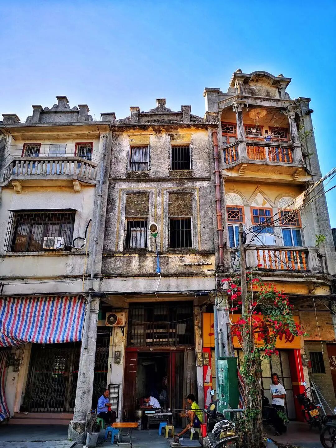 學(xué)校最初叫崇禮學(xué)校,1949年后更名為大灣小學(xué)。這座臺山常見的祠校合一建筑,正門是典型的傳統(tǒng)祠堂風(fēng)格,兩側(cè)陽臺卻用了羅馬柱,三角形山花更是西式典型設(shè)計(jì)。有趣的是,羅馬柱和山花之間的綠色琉璃瓦當(dāng)又是中式元素,混搭風(fēng)格十分鮮明。