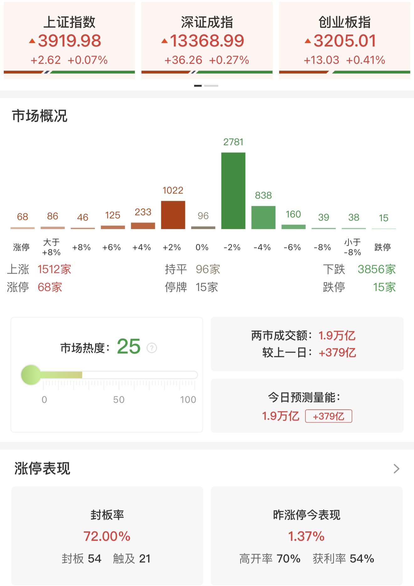 滬深兩市當(dāng)日成交額達(dá)1.9萬億元,較前一交易日增加379億元。全市場近3900只個股下跌。截至收盤,滬指上漲0.07%,深成指上漲0.27%,創(chuàng)業(yè)板指上漲0.41%。