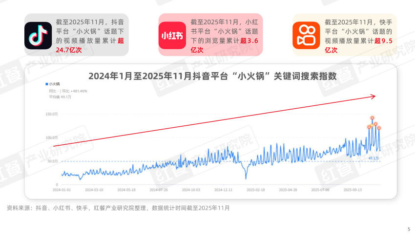 巨量算數(shù)平臺數(shù)據(jù)顯示,“小火鍋”關(guān)鍵詞搜索指數(shù)從2024年初不足50萬,攀升至2025年11月的150萬左右。社交平臺上相關(guān)話題熱度同樣高漲,截至2025年11月,小紅書“小火鍋”話題累計瀏覽量超3.6億次,快手、抖音相關(guān)視頻播放量分別超9.5億次和24.7億次。