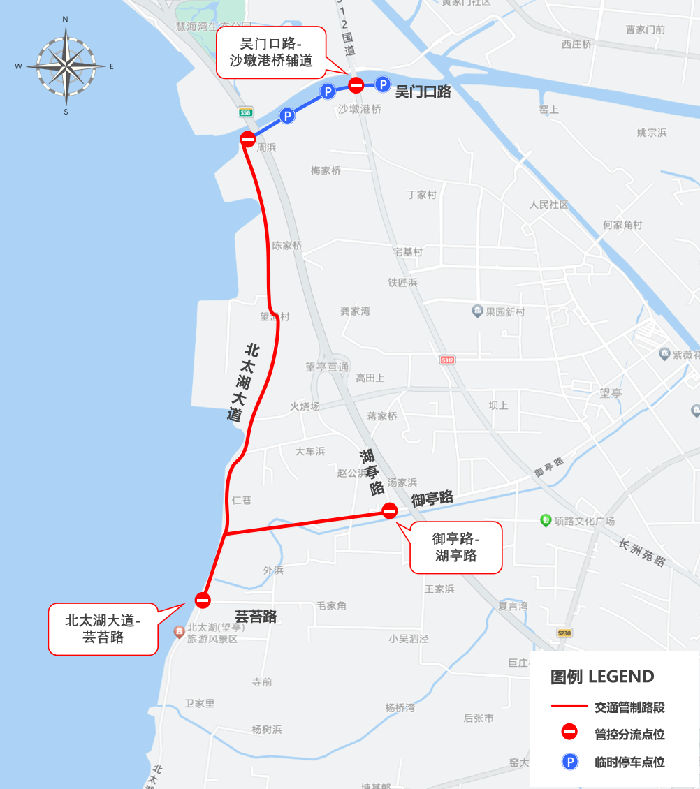 具體管控分流點(diǎn)位包括御亭路湖亭路路口、北太湖大道蕓苔路路口、沙墩港橋輔道(吳門口路)。