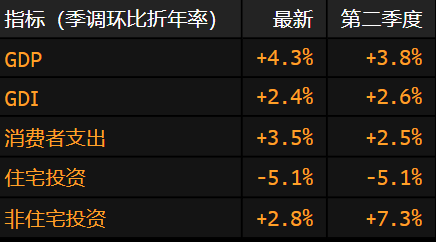 美國(guó)經(jīng)濟(jì)分析局于周二發(fā)布的報(bào)告顯示,經(jīng)通脹調(diào)整后,第三季度美國(guó)國(guó)內(nèi)生產(chǎn)總值(GDP)按年率計(jì)算增長(zhǎng)4.3%。這一增長(zhǎng)數(shù)據(jù)不僅超出了彭博社調(diào)查中除一位經(jīng)濟(jì)學(xué)家外所有受訪者的預(yù)期,還高于第二季度3.8%的增速。