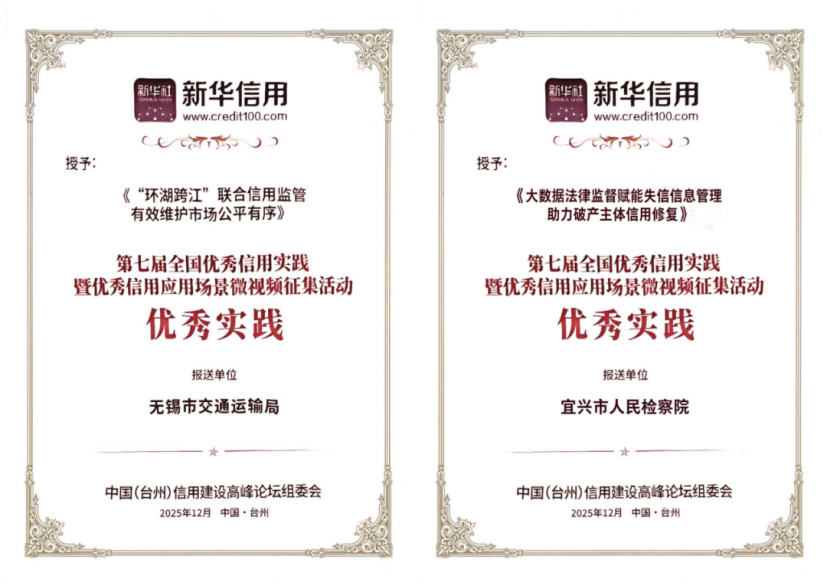 1、【全國“八連冠”!無錫“信用建設(shè)”創(chuàng)歷史最好成績】 近日,無錫信用建設(shè)領(lǐng)域再傳捷報:《“環(huán)湖跨江”聯(lián)合信用監(jiān)管有效維護市場公平有序》《大數(shù)據(jù)法律監(jiān)督賦能失信信息管理助力破產(chǎn)主體信用修復(fù)》兩個案例憑借扎實的實踐成效與突出的創(chuàng)新探索,獲評第七屆“新華信用杯”全國信用應(yīng)用場景優(yōu)秀實踐,為社會信用體系建設(shè)提供了可復(fù)制、可推廣的“無錫經(jīng)驗”。
