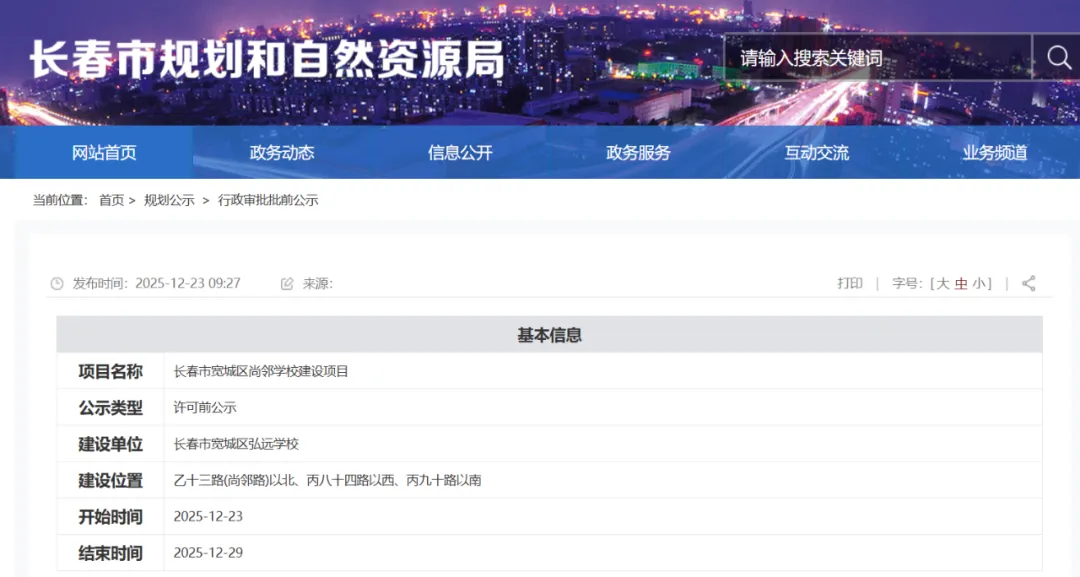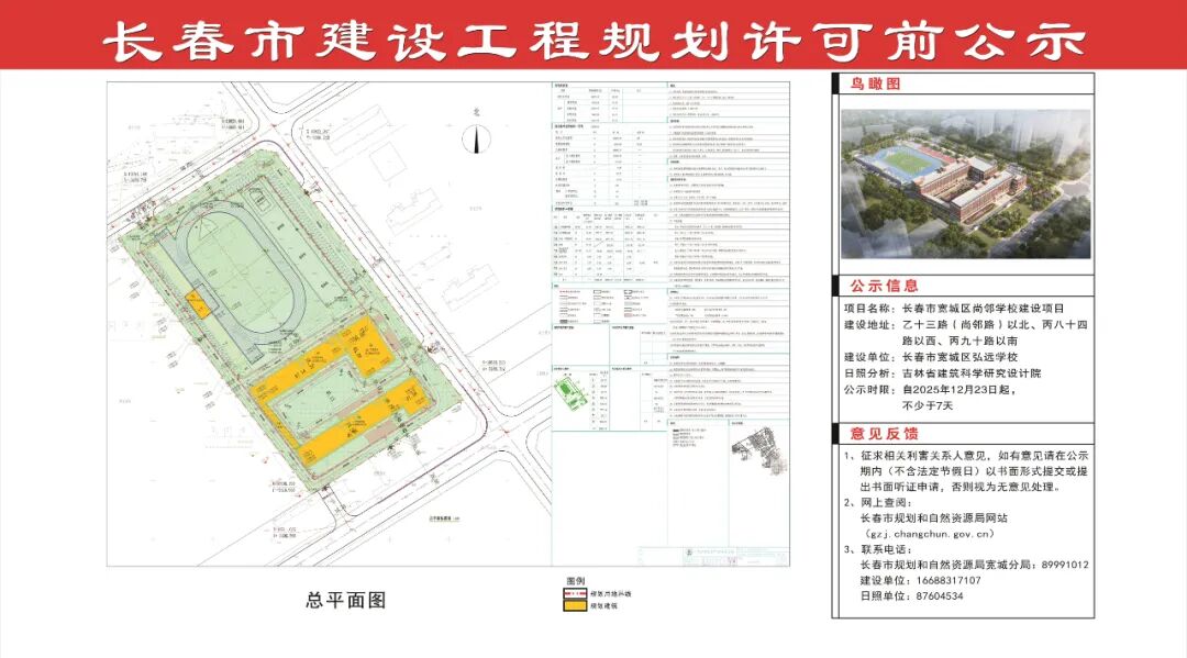 12月23日,長春市規(guī)劃和自然資源局官網(wǎng)發(fā)布了寬城區(qū)尚鄰學(xué)校建設(shè)項目的工程規(guī)劃許可前公示信息。該項目的建設(shè)主體為長春市寬城區(qū)弘遠學(xué)校,校址選定在乙十三路(尚鄰路)北側(cè)、丙八十四路西側(cè)與丙九十路南側(cè)圍合的區(qū)域。具體公示內(nèi)容如下: