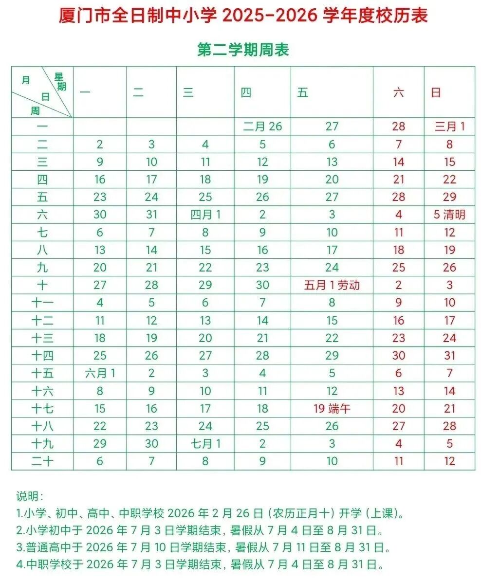 第二學(xué)期:2026年3月4日(農(nóng)歷正月十六,星期三)正式上課,2026年7月1日(星期三)學(xué)期結(jié)束。2026年7月2日(星期四)暑假開始,2026年8月30日(星期日)暑假結(jié)束。